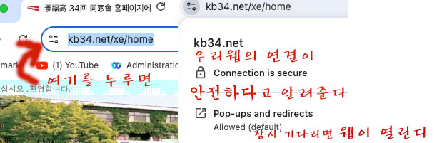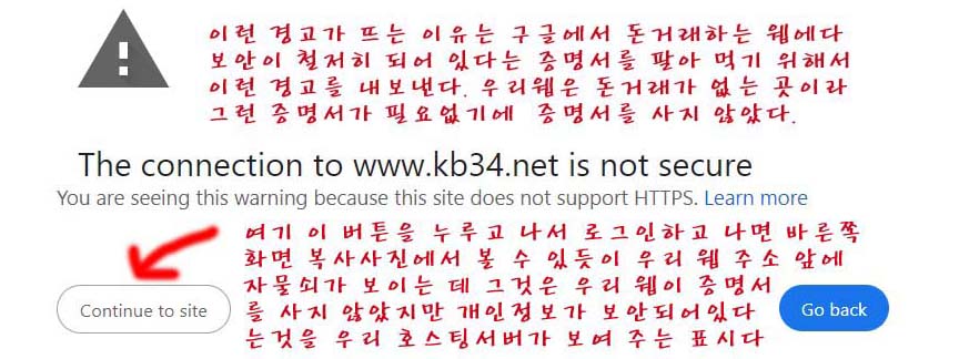 이 웹 방문은 안전하게 설정되어 있으니 걱정 하지 말고, 접근하려는 웹이 안전하지 않다는 경고가 뜰 때 그 경고는 구굴에서 웹안전 증명을 팔려는 시도로 보고 그 경고 맨 아래에 다시 입장을 시도하겠냐는 버튼을 누루면 문제없이 우리 홈페이지가 뜰 것임.